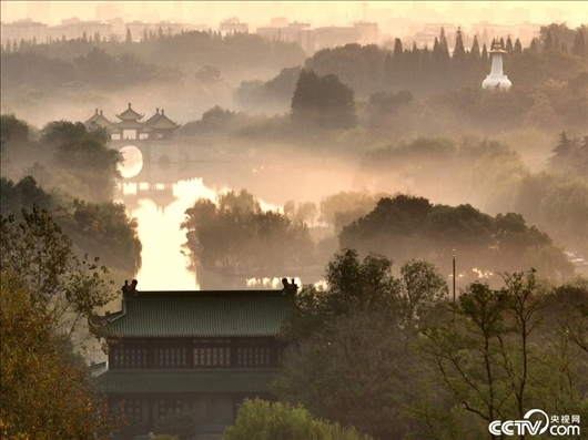 江蘇揚州,瘦西湖風(fēng)景區(qū)云霧繚繞,如夢似幻。