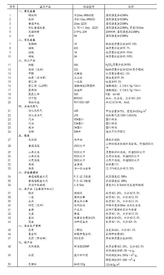 流通領(lǐng)域重要生產(chǎn)資料市場(chǎng)價(jià)格監(jiān)測(cè)內(nèi)容包括9大類50種產(chǎn)品的價(jià)格。類別與產(chǎn)品規(guī)格說(shuō)明詳見(jiàn)附表。