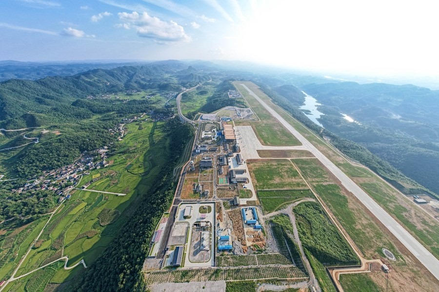 這是8月17日在湖南省湘西土家族苗族自治州花垣縣花垣鎮(zhèn)老天坪村拍攝的湘西邊城機場(無人機照片)。新華社記者 陳思汗 攝