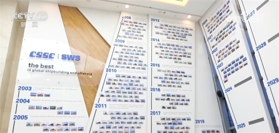 總臺(tái)央視記者 吳天白:在中國(guó)船舶外高橋造船,我們發(fā)現(xiàn)了這樣一面墻,墻上一共貼著553張已交付船型的照片。從最早的散貨船、原油船,再到超大型液化氣船、自升式鉆井平臺(tái),包括今天要貼到這面墻上的國(guó)產(chǎn)首艘大型郵輪。我們可以看到,隨著時(shí)間的推移,交付船型的附加值變得越來(lái)越高,這也體現(xiàn)著我國(guó)造船能力質(zhì)的飛躍。