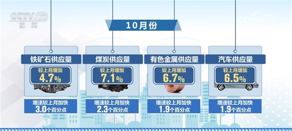 各主要商品中,鐵礦石、煤炭、有色金屬和汽車供應(yīng)量繼續(xù)增長(zhǎng),并且增速加快;鋼鐵和化工供應(yīng)量雖有增加,但增速有所減緩。具體來看,10月份鐵礦石、煤炭、有色金屬和汽車供應(yīng)量較上月分別增加4.7%、7.1%、6.7%和6.5%,增速較上月分別加快3.0、2.3、1.9和1.9個(gè)百分點(diǎn)。