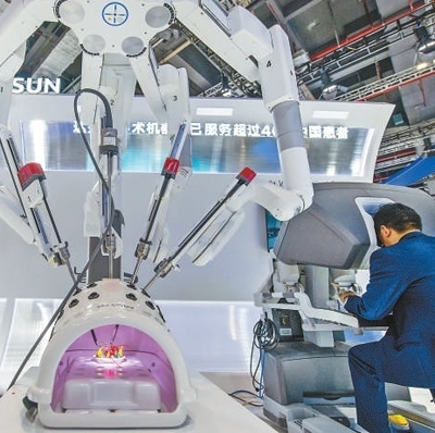 在醫(yī)療器械及醫(yī)藥保健展區(qū),參觀者正在體驗(yàn)操作復(fù)星醫(yī)藥首臺(tái)國產(chǎn)“達(dá)芬奇Xi手術(shù)系統(tǒng)”。人民網(wǎng)記者 翁奇羽攝