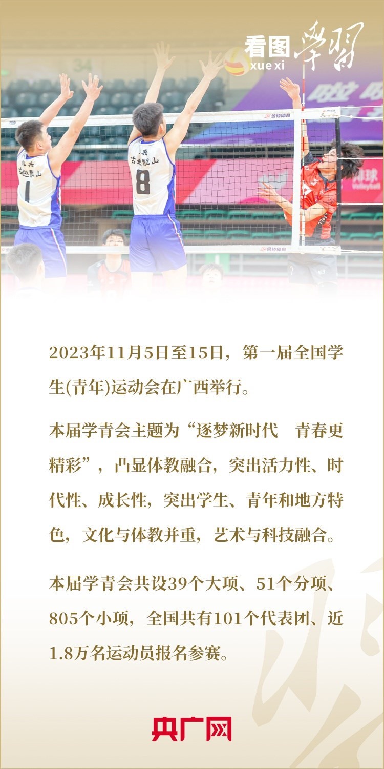 11月5日至15日,第一屆全國學生(青年)運動會在廣西舉行。這是全國青年運動會和全國學生運動會合并后的第一屆運動會,是加快體育強國建設、加快健康中國建設、深化體教融合發(fā)展、促進青少年健康成長的重要舉措。