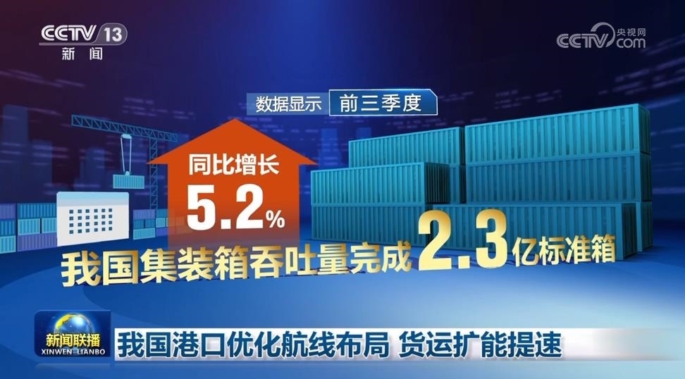 數(shù)據(jù)顯示,前三季度我國集裝箱吞吐量完成2.3億標(biāo)準(zhǔn)箱,同比增長5.2%。其中第三季度增長5.9%,增速較上半年加快1個百分點(diǎn)。