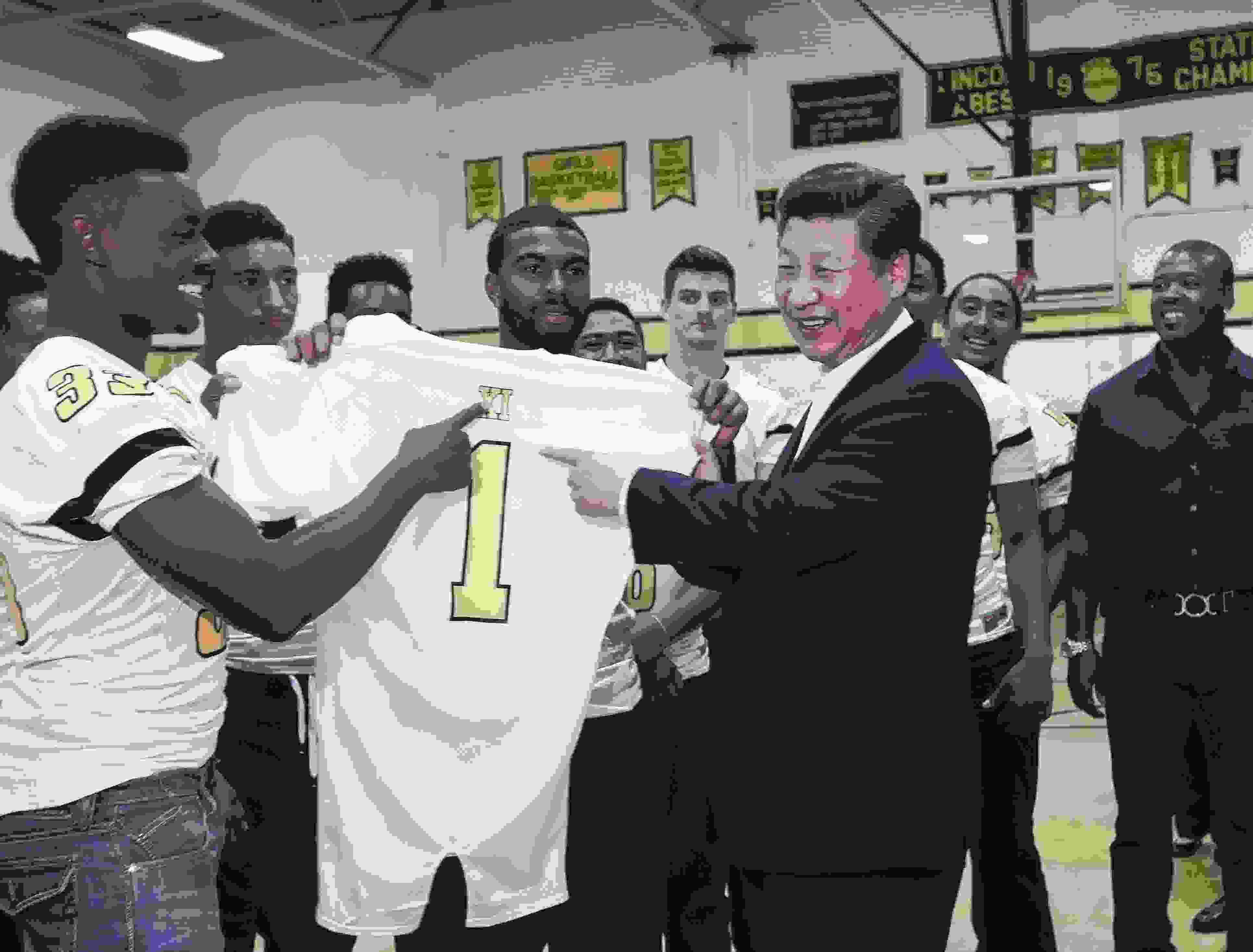 △ 2015年9月23日,國家主席習(xí)近平參觀美國塔科馬市林肯中學(xué)。這是習(xí)近平接受學(xué)生們贈送的橄欖球衣。