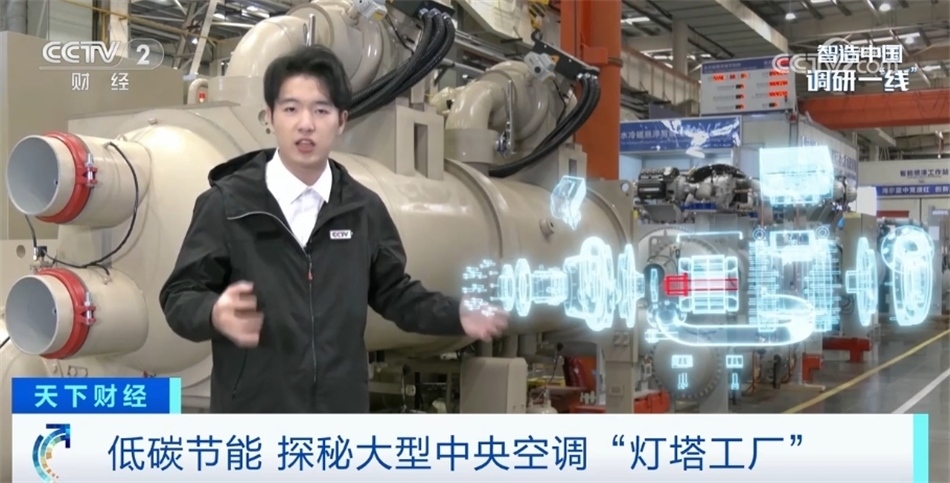 總臺央視記者 吳柏辰:今天我們來到的是位于山東青島的一家生產中央空調的“燈塔工廠”,這里生產的空調跟我們平時家用的不一樣,我身邊這樣的大家伙就是一臺商用中央空調的主機。要知道一棟寫字樓或者商場,空調制冷和制熱的能耗往往能能夠占到整體能耗的60%以上。這種大型空調如何用最少的電獲得最大的制冷或制熱效果?關鍵就在于空調主機的壓縮機,我們可以看到在這臺空調頂端的這個白色裝置氣懸浮壓縮機,它采用的就是一種空氣動力學技術。就像我們熟知的飛機機翼通過上下空氣流動的速度不同所產生的浮力,它就運用了同樣的原理。