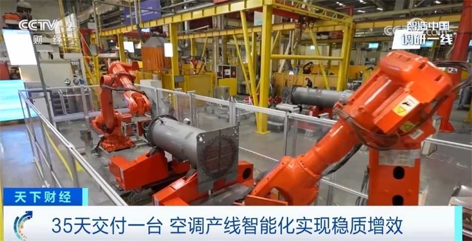 可以看到我身邊這條過道旁擺滿了產品,目前這家工廠所生產的中央空調處于訂單爆滿的狀態(tài)。生產一臺中央空調所需要的工序能夠達到上百道,目前這座“燈塔工廠”目前能夠做到最快35天交付產品,這與超級產線背后的智能化改造密不可分。空調主機下方的大型腔體,它內部最多將安裝上千根換熱銅管,這些銅管與腔體之間沒有任何的焊接或黏合,是完全通過膨脹變形來完成固定與密封。這就意味著銅管安裝的好壞直接決定了這臺主機會不會泄漏制冷劑。目前這道工序已經交由機械臂來完成,不僅安裝的時間由原來人工的兩個小時縮短至四十五分鐘,而且通過人工智能視覺檢測技術,保障空調主機零泄漏。