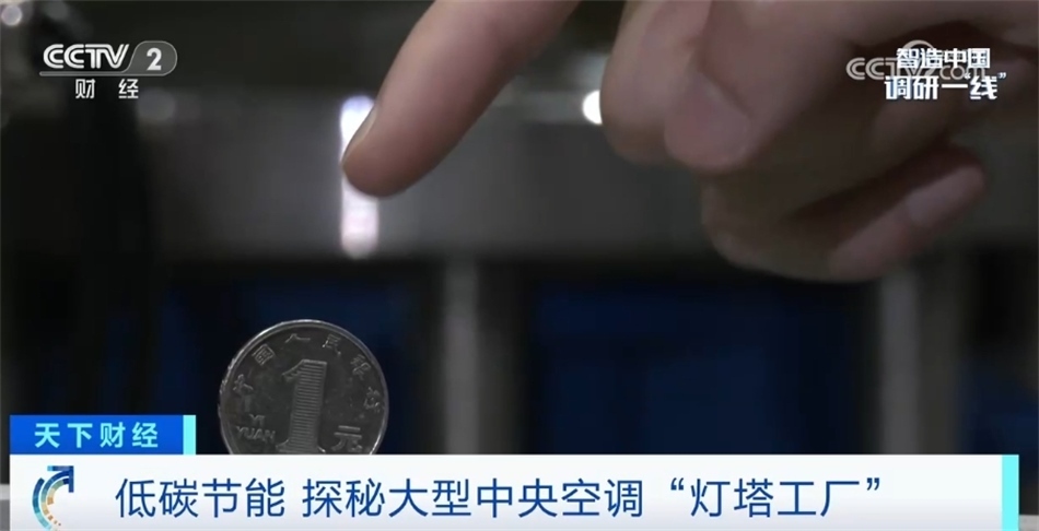 我現(xiàn)在走進的這個區(qū)域是空調產線的末端——檢測平臺。每一臺空調出廠前都要在這里經過全方位的檢測。眼前這就是一臺正在運轉的氣懸浮中央空調,我們在空調上立了一枚硬幣,可以看到是紋絲不動的,這也是氣懸浮的特點之一——運行比較平穩(wěn)。在這塊屏幕上顯示著空調的出水溫度7℃,恒定的出水溫度讓這臺空調產生的冷風非常柔和。目前,這座工廠全流程的自動化生產能夠滿足從小型商用空調生產到用戶需求的大規(guī)模定制。目前低能耗、智能化產品已應用在商業(yè)地產、酒店、軌道交通等各種場景,極大程度助力著國家“雙碳”政策以及各大行業(yè)的低碳轉型。