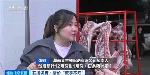 湖南某生鮮配送有限公司負責人 張敏:10月份到11月份(每天銷量)是450頭到600頭。預計12月份到1月份(白條豬銷量)會增長到一天800頭到1000頭。
