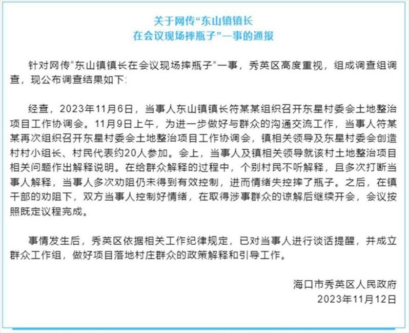 ·海口秀英區(qū)通報“東山鎮(zhèn)鎮(zhèn)長在會議現(xiàn)場摔瓶子”:已對當事人進行談話提醒。