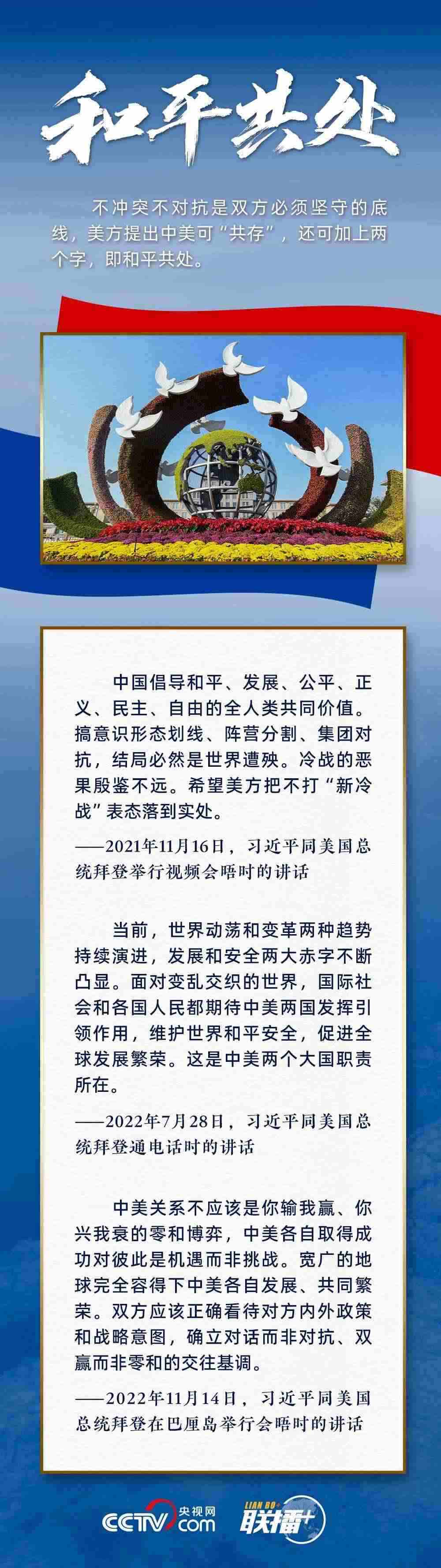 “中美不沖突、不對抗、和平共處,這是兩國最基本的共同利益。”習(xí)主席指出,遵守國際關(guān)系基本準則和中美三個聯(lián)合公報,這是雙方管控矛盾分歧、防止對抗沖突的關(guān)鍵,也是中美關(guān)系最重要的防護和安全網(wǎng)。