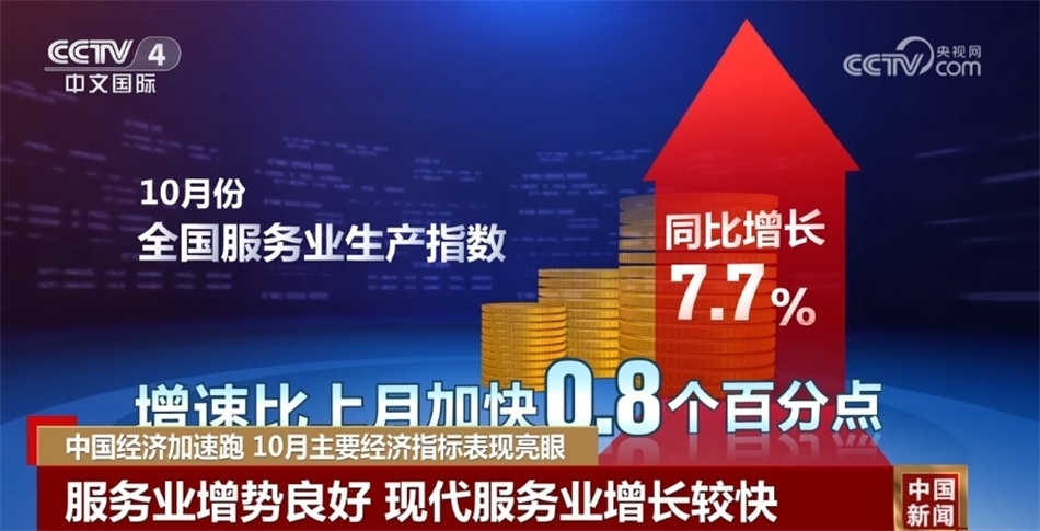 再來(lái)看服務(wù)業(yè)。服務(wù)業(yè)增勢(shì)良好,現(xiàn)代服務(wù)業(yè)增長(zhǎng)較快。10月份,服務(wù)業(yè)生產(chǎn)指數(shù)同比增長(zhǎng)7.7%,比上月加快0.8個(gè)百分點(diǎn)。其中,住宿和餐飲業(yè)、批發(fā)和零售業(yè)、交通運(yùn)輸倉(cāng)儲(chǔ)和郵政業(yè)等聚集型服務(wù)業(yè)都保持兩位數(shù)增長(zhǎng)。
