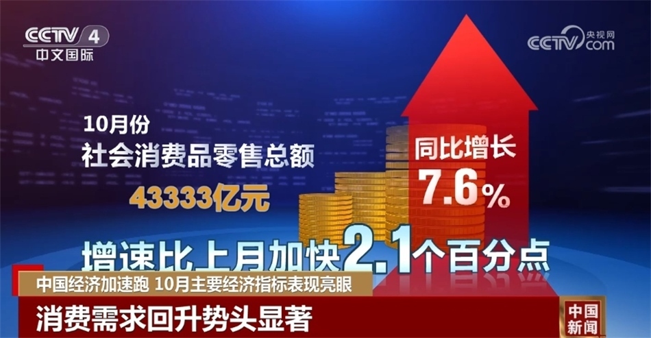 央視網(wǎng)消息:來(lái)關(guān)注中國(guó)經(jīng)濟(jì)10月報(bào)。國(guó)家統(tǒng)計(jì)局昨天(11月15日)發(fā)布了10月份經(jīng)濟(jì)主要指標(biāo)。數(shù)據(jù)顯示,隨著宏觀調(diào)控政策持續(xù)發(fā)力顯效,全國(guó)生產(chǎn)供給穩(wěn)中有升,市場(chǎng)需求持續(xù)改善,就業(yè)物價(jià)總體穩(wěn)定,高質(zhì)量發(fā)展扎實(shí)推進(jìn),國(guó)民經(jīng)濟(jì)持續(xù)恢復(fù)向好。