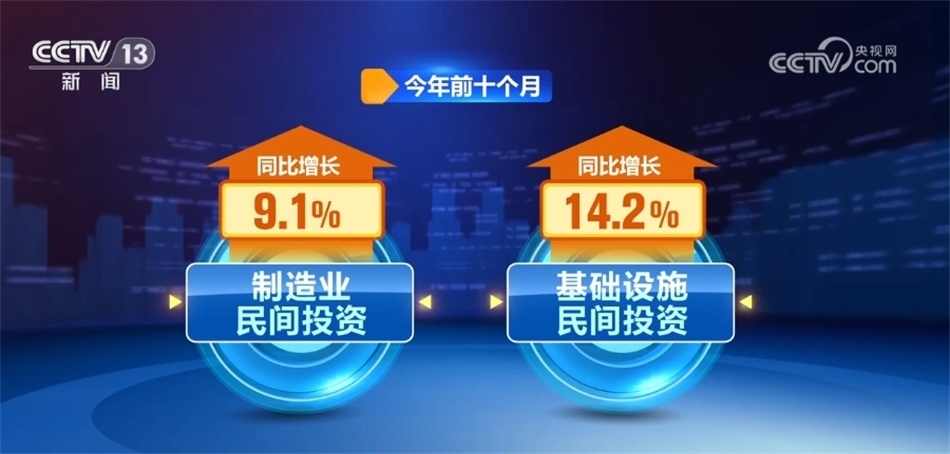 ?????? 政府有效投資疊加政策引領(lǐng),正激發(fā)全社會投資活力。今年前十個月,制造業(yè)、基礎(chǔ)設(shè)施民間投資同比分別增長9.1%和14.2%。