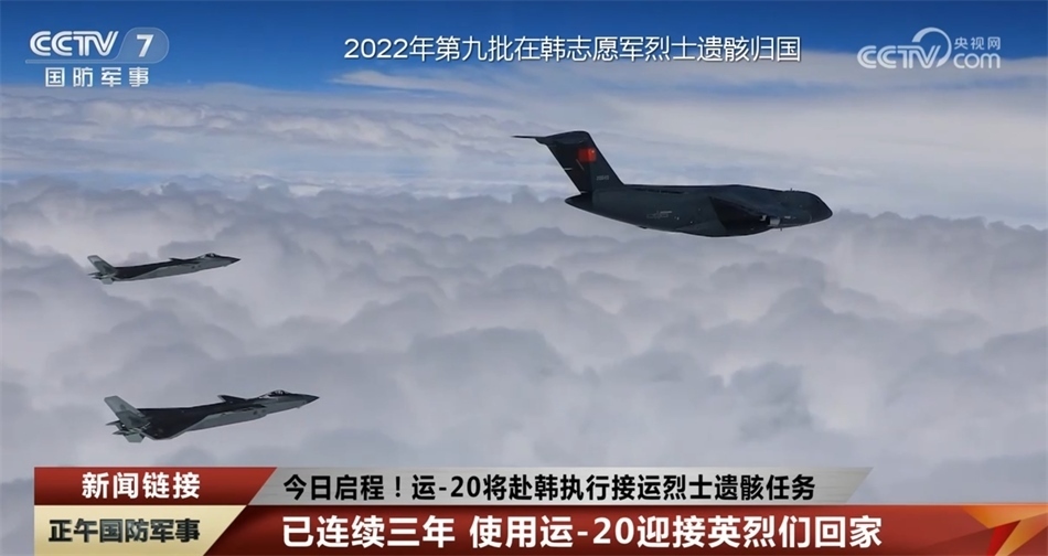2022年9月16日,我國(guó)從韓國(guó)接回第九批88位在韓中國(guó)人民志愿軍烈士遺骸。當(dāng)運(yùn)-20進(jìn)入我國(guó)領(lǐng)空后,兩架殲-20編隊(duì)護(hù)航,大國(guó)重器“雙20”列陣長(zhǎng)空,告慰革命英烈。這是空軍首次以“雙20同框”的畫(huà)面接迎志愿軍烈士遺骸歸國(guó)。
