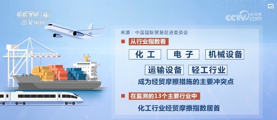 而從行業(yè)指數(shù)看,化工、電子、機(jī)械設(shè)備、運輸設(shè)備和輕工行業(yè)成為經(jīng)貿(mào)摩擦措施的主要沖突點。在監(jiān)測的13個主要行業(yè)中,化工行業(yè)經(jīng)貿(mào)摩擦指數(shù)居首。