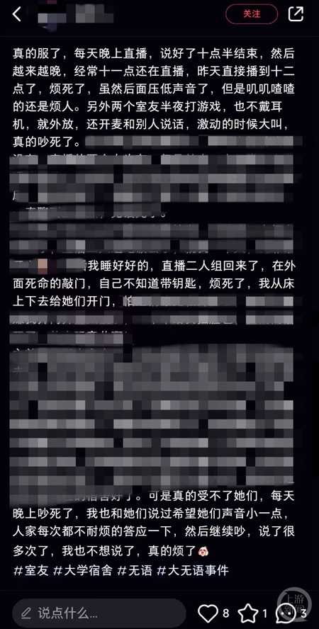 在某社交平臺搜索“室友在宿舍直播”,上游新聞記者發(fā)現超過50篇筆記都是有關大學生寢室直播引發(fā)室友不滿:“每天晚上吵死了,我也和她們說過希望她們聲音小一點,人家每次都不耐煩地答應一下,然后繼續(xù)吵”“我覺得在寢室直播就是不合適啊,但是想不到什么嚴肅有效的理由讓她不直播,求大家?guī)兔Τ鲋\劃策一下”……