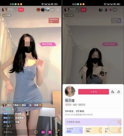在另一社交平臺中,面容姣好、標簽為“大學生”的女主播“丫頭XXX”在23日凌晨1點過仍在直播,她和一位上了年紀的男性連麥互動,直播間標簽寫著“穿云箭帶走、啤酒俯臥撐、私人**任你、喜歡你進裙”。