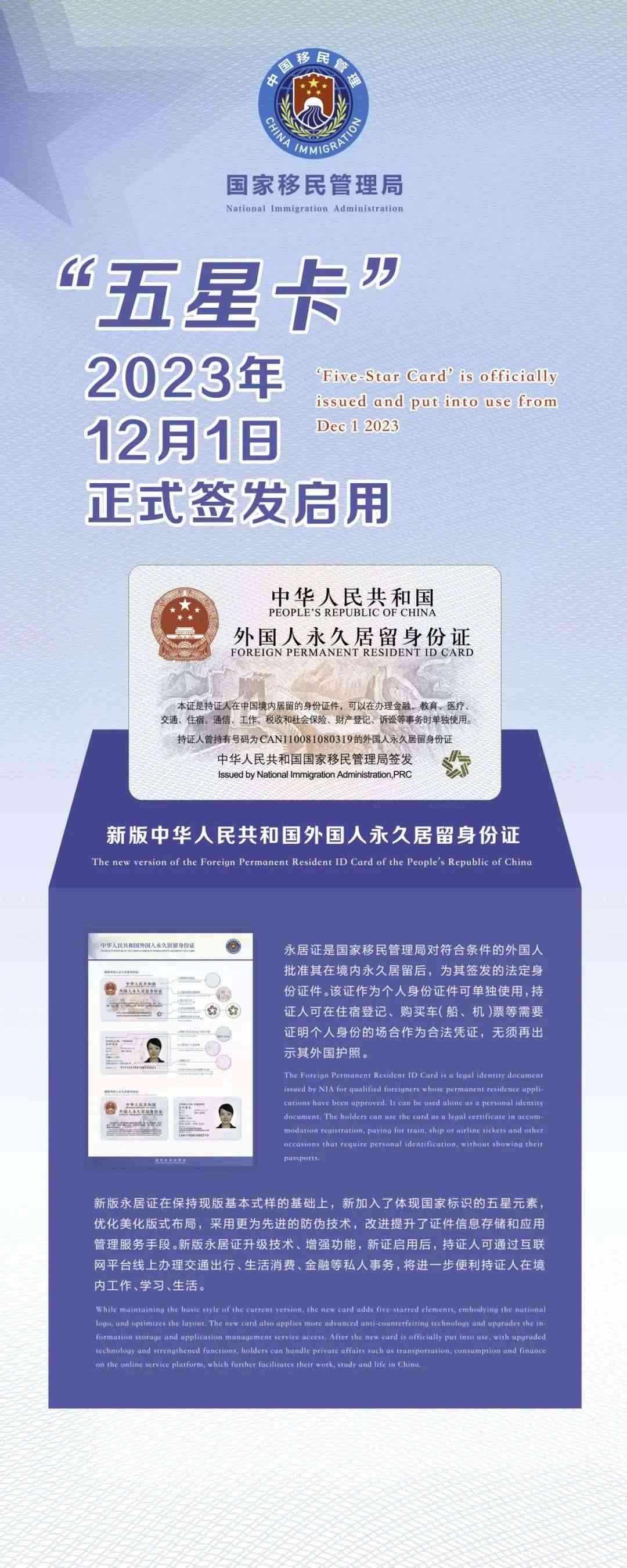 國家移民管理局相關(guān)負責(zé)人介紹,“五星卡”由國家移民管理局簽發(fā),是經(jīng)批準在中國境內(nèi)永久居留外國人的法定身份證件。持證人可在需要證明個人身份的場合作為個人身份憑證單獨使用,無須再出示其外國護照?!拔逍强ā眱?yōu)化了證件信息存儲方式,美化了版式布局,采用了更為先進的防偽技術(shù),增強了個人信息保護和數(shù)據(jù)安全性。國家移民管理局會同有關(guān)部門大力推進各相關(guān)行業(yè)領(lǐng)域應(yīng)用系統(tǒng)、設(shè)施設(shè)備的適配性升級改造,便于持證人在交通出行、生活消費、金融通信等公共服務(wù)、政務(wù)服務(wù)領(lǐng)域和互聯(lián)網(wǎng)平臺使用。