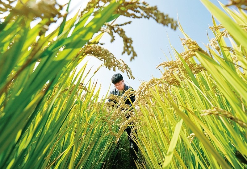 近年來,河北省唐山市通過鹽堿地土壤科學改良、耐堿作物品種培育、適用耕作技術(shù)研究應用等系列治理措施,在鹽堿地上開發(fā)建設(shè)了高標準農(nóng)田88.6萬畝,有效提高鹽堿地利用水平。圖為2023年10月11日,農(nóng)業(yè)科研人員在唐山市曹妃甸區(qū)第五農(nóng)場鹽堿地改良而成的高標準稻田內(nèi)工作。 新華社記者 楊世堯/攝