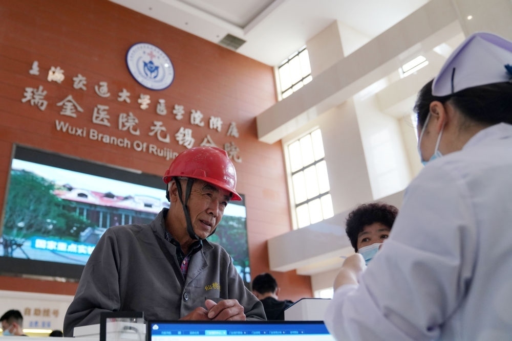 2023年5月18日,在位于江蘇省無錫市的上海交通大學(xué)醫(yī)學(xué)院附屬瑞金醫(yī)院無錫分院,就診者在服務(wù)臺咨詢。