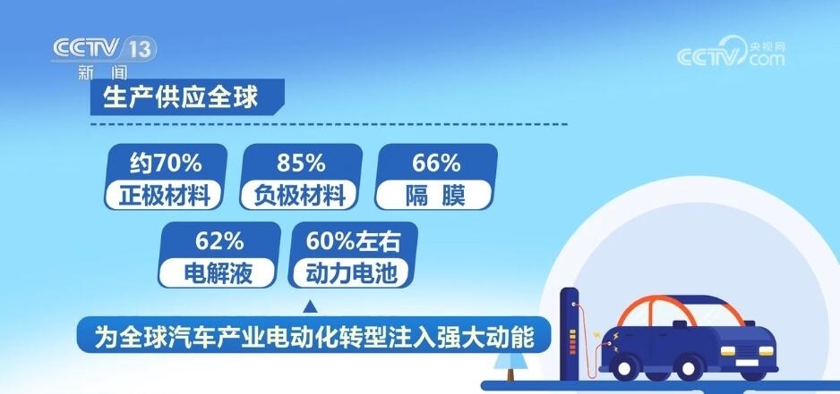 工業(yè)和信息化部表示,我國已建立了結(jié)構(gòu)完整、有機協(xié)同的新能源汽車產(chǎn)業(yè)鏈、供應(yīng)鏈體系,涵蓋基礎(chǔ)材料、零部件、整車、制造裝備等全鏈條,生產(chǎn)供應(yīng)了全球約70%的正極材料、85%的負極材料、66%的隔膜、62%的電解液以及60%左右的動力電池,為全球汽車產(chǎn)業(yè)電動化轉(zhuǎn)型注入了強大動能。