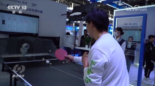 數(shù)字科技鏈的展館有一臺全球首款擬人型發(fā)球機(jī)器人,能實(shí)時(shí)捕捉高速乒乓球的軌跡,生成專業(yè)報(bào)告,數(shù)字科技讓運(yùn)動(dòng)變得更加有趣。