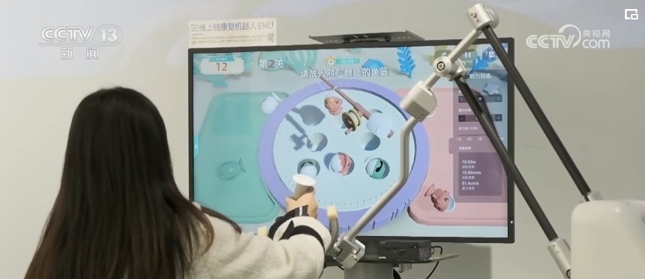 總臺(tái)記者 竇筠韻:幫助病人進(jìn)行康復(fù)的機(jī)器人,可以根據(jù)病人手部力量的多少進(jìn)行輔助推力,機(jī)器界面上還有各種有趣的游戲,使得康復(fù)訓(xùn)練不無聊。
