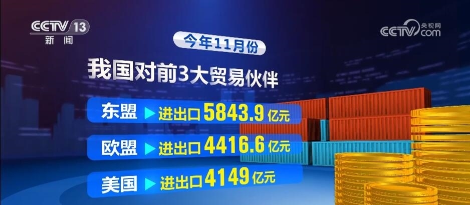 海關統(tǒng)計數(shù)據(jù)顯示,今年11月份,我國對前3大貿(mào)易伙伴東盟、歐盟、美國分別進出口5843.9億元、4416.6億元、4149億元,合計占我國進出口總值的38.9%;對共建“一帶一路”國家進出口1.72萬億元。同期,我國與拉美、非洲、中亞五國進出口延續(xù)良好態(tài)勢,分別增長9.3%、8.4%、43%。
