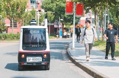 在浙江省金華職業(yè)技術(shù)學(xué)院的校園里,一輛無(wú)人快遞車在配送快遞。胡肖飛攝(人民圖片)
