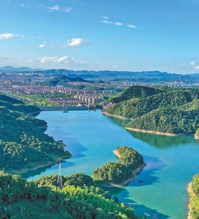 浙江安吉縣鳳凰水庫,碧水藍天,綠意盎然。