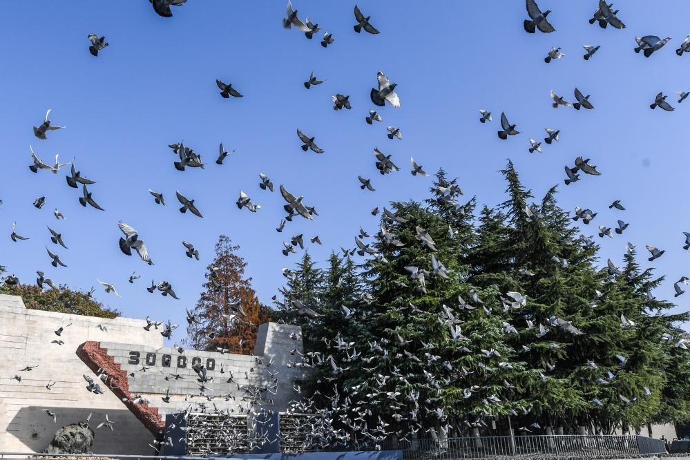 2022年12月13日,南京大屠殺死難者國(guó)家公祭儀式現(xiàn)場(chǎng)放飛和平鴿。 新華社記者李博 攝