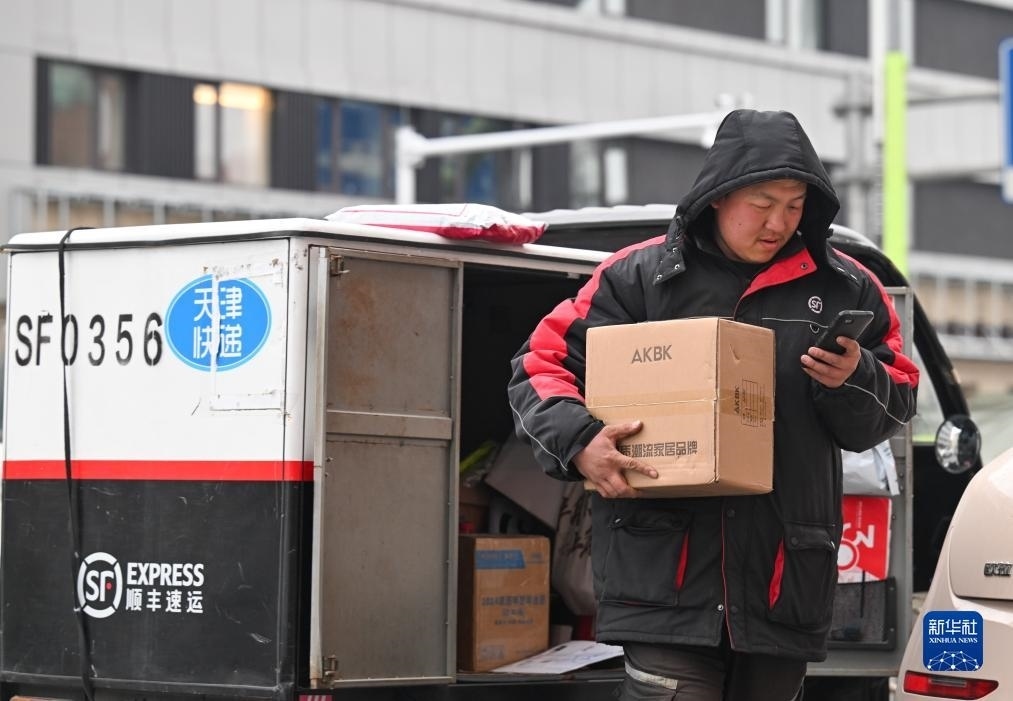 12月12日,在天津市南開區(qū)水上公園街道,快遞員在派送郵件。
