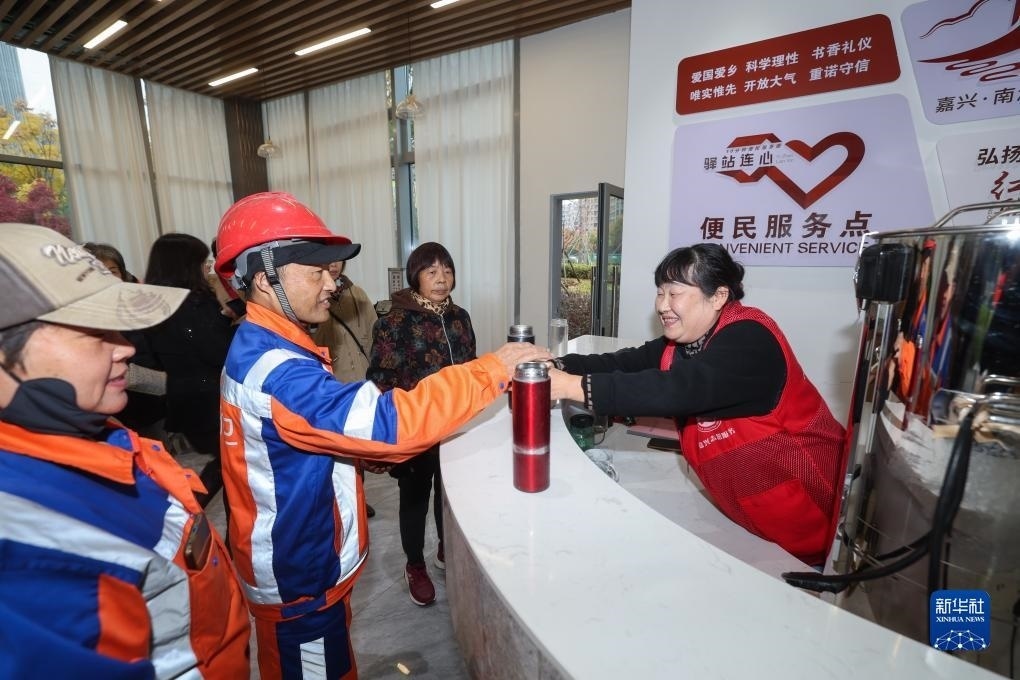 12月12日,在浙江省嘉興市南湖區(qū)的“禾城驛·溫暖嘉”連心驛站,志愿者為環(huán)衛(wèi)工人等戶外工作者提供熱豆?jié){,該驛站近期每天早上向戶外工作者免費(fèi)提供100多杯熱豆?jié){。