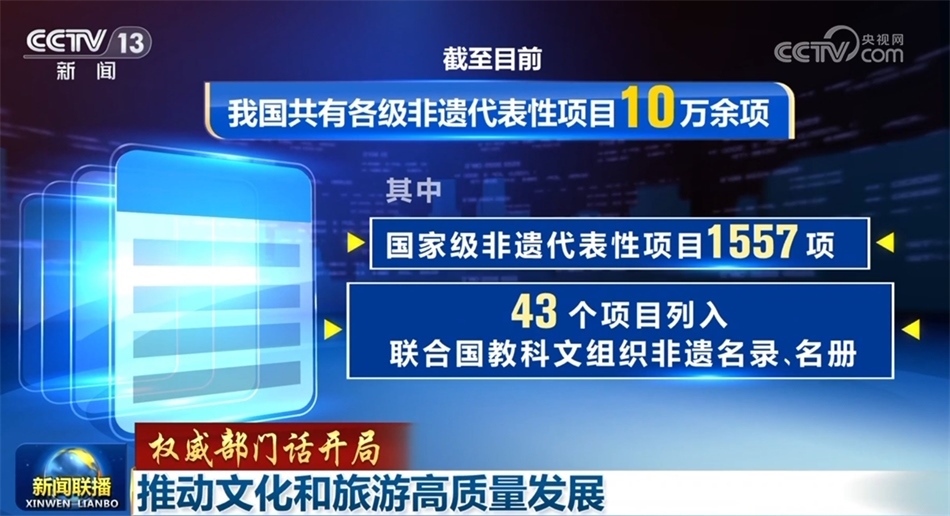 繁榮發(fā)展文化事業(yè)和文化產(chǎn)業(yè),推進城鄉(xiāng)公共文化服務(wù)體系提質(zhì)增效。今年前11個月,文化和旅游部主辦27項展演展示活動,線下觀眾90萬人次,線上觀看量超過18億次,一批彰顯中華審美風(fēng)范、富有鮮明時代氣息的舞臺藝術(shù)作品廣受好評。保護傳承弘揚中華優(yōu)秀傳統(tǒng)文化,中華文明探源工程、考古中國等重大項目得以深入實施,截至目前,我國共有各級非遺代表性項目10萬余項,其中國家級非遺代表性項目1557項,43個項目列入聯(lián)合國教科文組織非遺名錄(名冊),中國世界遺產(chǎn)數(shù)量增至57項。