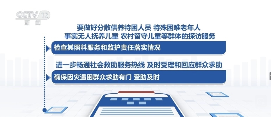 要做好分散供養(yǎng)特困人員、特殊困難老年人、事實無人撫養(yǎng)兒童、農(nóng)村留守兒童等群體的探訪服務,檢查其照料服務和監(jiān)護責任落實情況。進一步暢通社會救助服務熱線,及時受理和回應群眾求助,確保因災遇困群眾求助有門、受助及時。