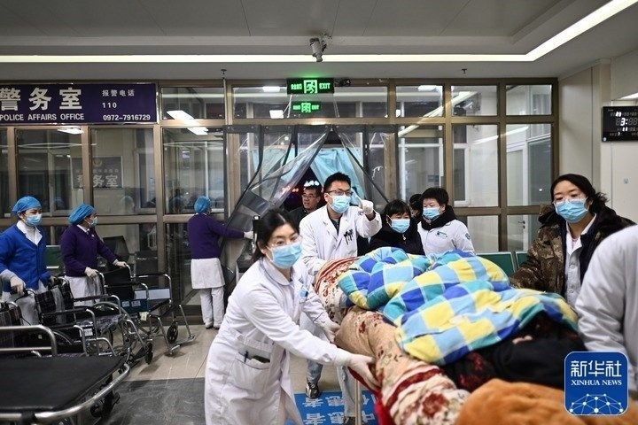 12月19日,地震傷員被送至甘肅省臨夏回族自治州積石山縣人民醫(yī)院。新華社記者 范培珅 攝
