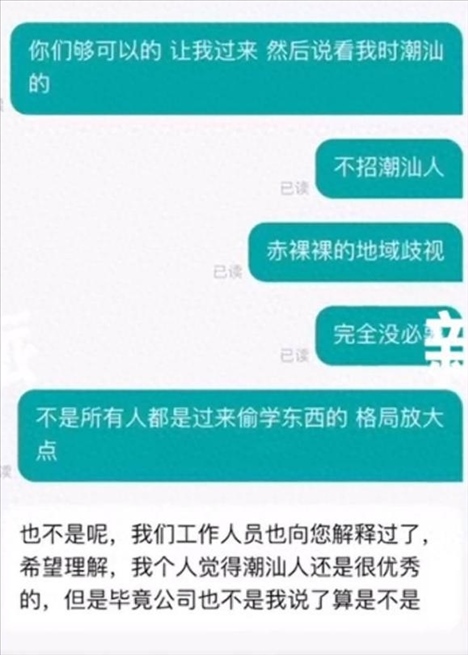 ·廣東深圳一男子求職因籍貫是潮汕直接被拒,工作人員稱“老板說潮汕人就會偷偷摸摸學(xué)東西”。