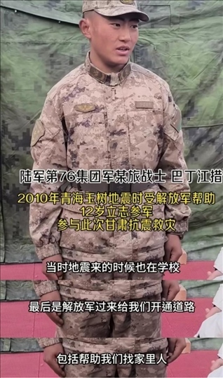 巴丁江措,第76集團(tuán)軍某旅戰(zhàn)士。2010年青海玉樹地震時,解放軍幫他脫險。如今,同樣成為解放軍的他奮戰(zhàn)在甘肅抗震救災(zāi)一線。他說:“我想對以前救我的人說,我?guī)椭烁嗳?,讓他們?yōu)槲因湴?!?/p>