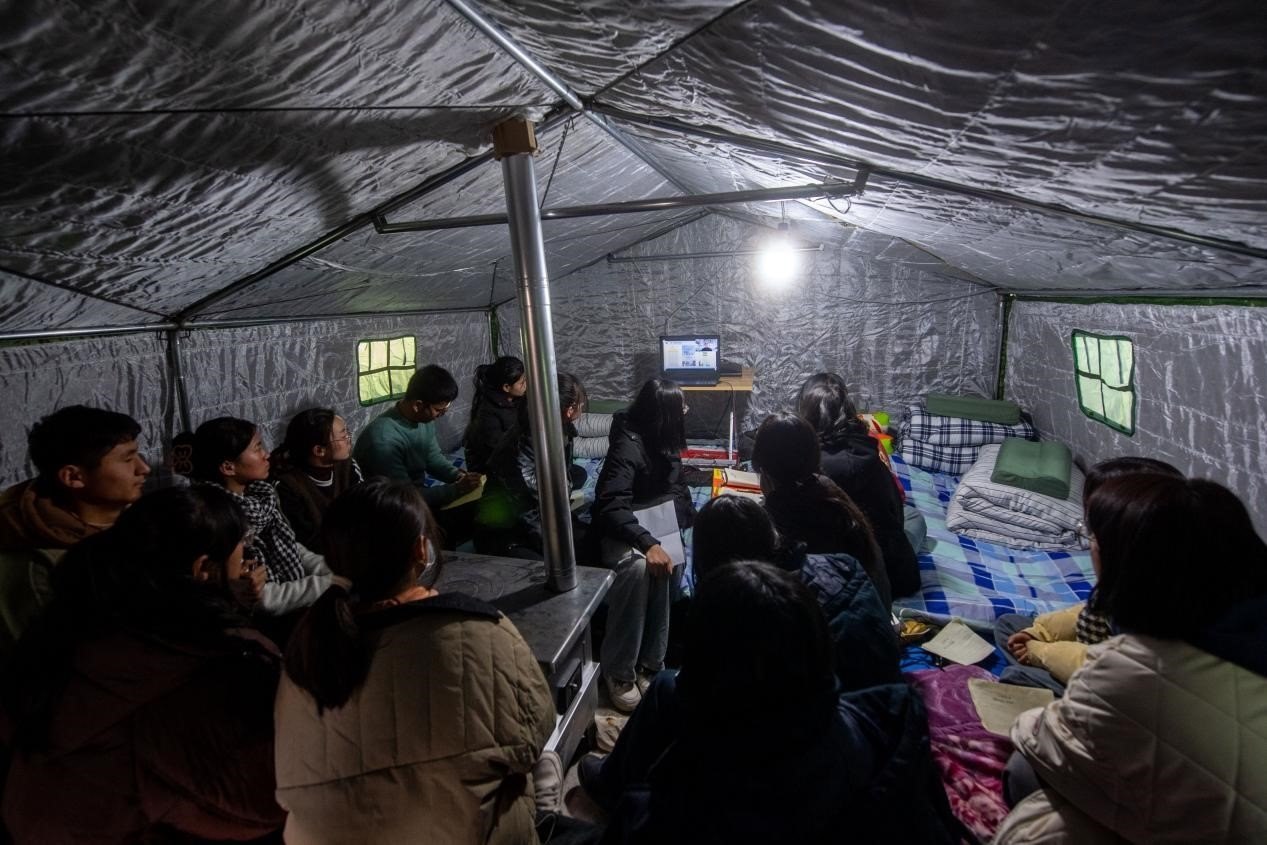 12月22日,在積石山縣大河家鎮(zhèn)大河村安置點,部分高中學生在帳篷中聽課。人民網(wǎng)記者 翁奇羽攝