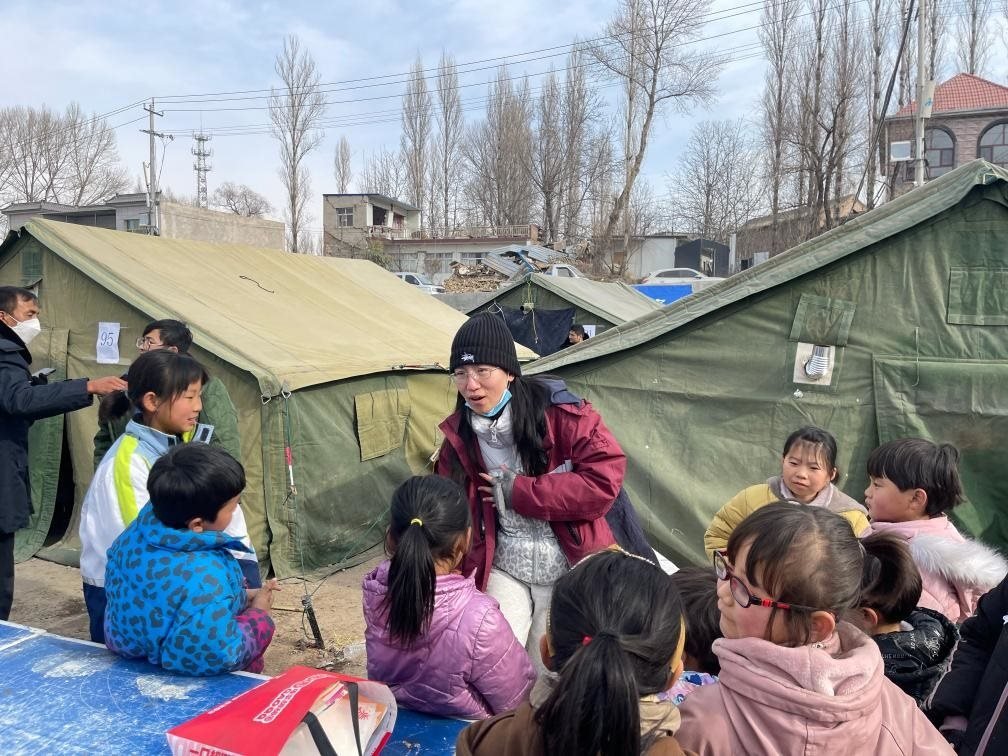 21日上午,馮小霞和24名同伴就從與積石山縣毗鄰的廣河縣抵達災區(qū),開展志愿服務。地震發(fā)生后,和馮小霞類似,來自多地的志愿者化身“帳篷城”里的“孩子王”,為大家開設了繪畫、文化課程輔導、防災救災知識等內(nèi)容的志愿服務。