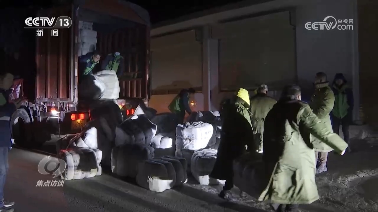 為了盡快給村民送去保障物資,刁四村村民的車隊日夜兼程。22日凌晨,歷經(jīng)32個小時,帶著全村2000多人的囑托,這個車隊跨越1600公里,終于抵達(dá)了積石山縣的安集鎮(zhèn)。顧不上休息,刁四村的村民就和當(dāng)?shù)卮迕褚黄鸢沿浳镄读讼聛怼N遘囄镔Y,足足卸了三個小時,其中包括2400件軍大衣、2580件棉被、1820副自發(fā)熱鞋墊。