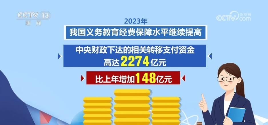 2023年,我國義務(wù)教育經(jīng)費保障水平繼續(xù)提高,中央財政下達的相關(guān)轉(zhuǎn)移支付資金高達2274億元,比上年增加148億元。2023年,一系列義務(wù)教育重大工程項目繼續(xù)實施,讓中小學(xué)辦學(xué)條件不斷優(yōu)化。其中,義務(wù)教育薄弱環(huán)節(jié)改善與能力提升項目中央安排330億元,支持各地義務(wù)教育學(xué)校標準化建設(shè)。