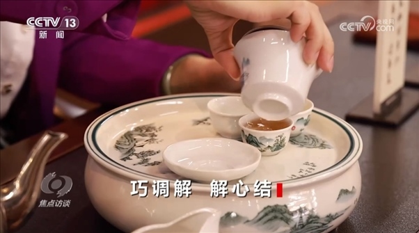 朱桂曼:“在調(diào)解過程中,我一邊給他們泡茶,一邊了解雙方當事人的立場和訴求,把握‘茶水均勻分配’的老規(guī)矩,不偏不倚,公正公平,結合講法講理講情,把握分寸,適度調(diào)解。就像我們泡茶時講究‘茶水七八分’,避免‘茶滿欺客’,矛盾激化。我勸兩位鄰居互相讓一讓,換位思考一下,鄰里之間以和為貴,低頭不見抬頭見?!?/p>