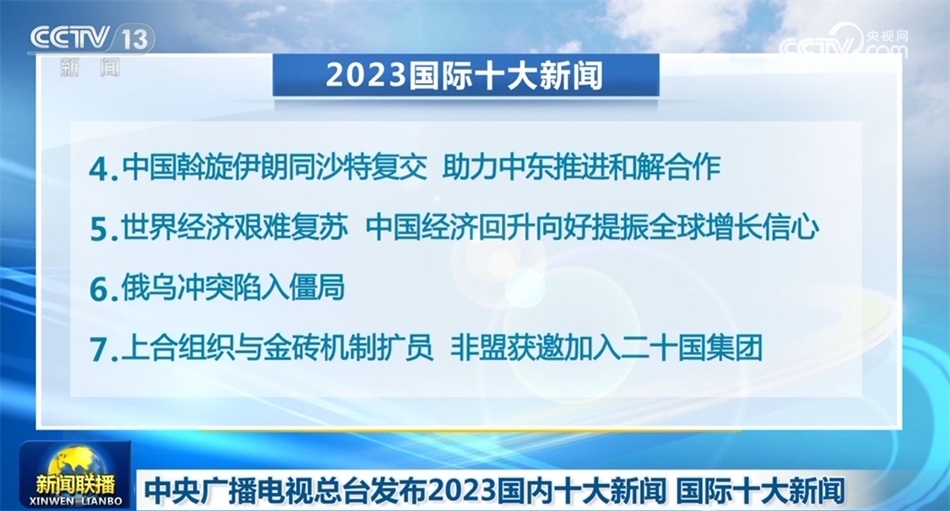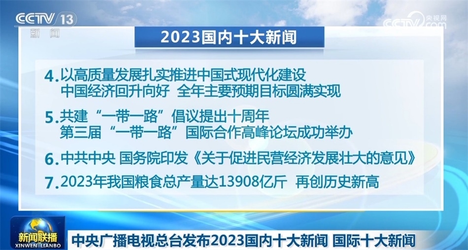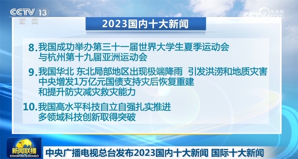 央視網(wǎng)消息(新聞聯(lián)播):中央廣播電視總臺(tái)今天(12月27日)發(fā)布2023國(guó)內(nèi)十大新聞和國(guó)際十大新聞。