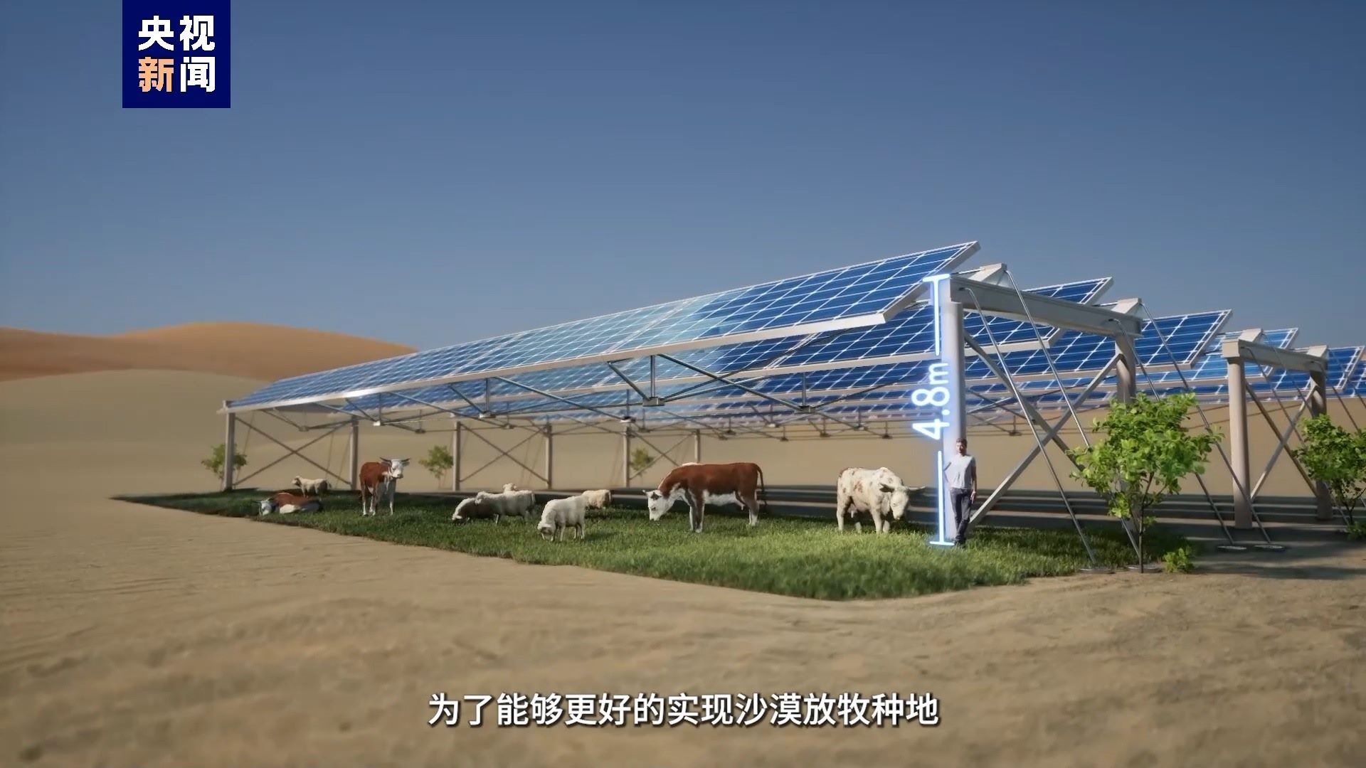 光伏板不僅能發(fā)電,還能遮擋一定的陽光照射,減少了下面土壤的水分蒸發(fā),為植物的生長提供了有利條件,為了能夠更好地實現(xiàn)沙漠放牧種地,會在建設(shè)前規(guī)劃光伏支架的高度和跨度,比如這里是燒烤區(qū)(牛羊放牧區(qū)),這里是沙拉區(qū)(蔬果種植區(qū)),這里是養(yǎng)生區(qū)(中藥種植區(qū)),接下來沙漠里還會有綠化帶區(qū),已經(jīng)安排上了。