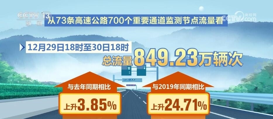從公安部交管局選取的73條高速公路700個(gè)重要通道監(jiān)測節(jié)點(diǎn)流量看,12月29日18時(shí)至30日18時(shí)總流量849.23萬輛次,與去年同期相比上升3.85%,與2019年同期相比上升24.71%;從53條國道300個(gè)重要通道監(jiān)測節(jié)點(diǎn)流量看,12月29日18時(shí)至30日18時(shí)總流量183.01萬輛次,與去年同期相比上升21.37%,與2019年同期相比上升53.57%。