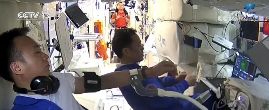 這張圖片展現(xiàn)的是神舟十七號乘組近期開展航天醫(yī)學領(lǐng)域?qū)嶒灥膱鼍埃陉犛褱椴ê徒铝值膸椭?,航天員唐勝杰穿戴起實驗儀器,進行下肢運動學測試實驗。