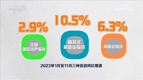 從投資看,2.9%、6.3%、10.5%,這三個數(shù)字分別是今年1—11月全國固定資產(chǎn)投資、制造業(yè)投資和高技術(shù)制造業(yè)投資的同比增速。