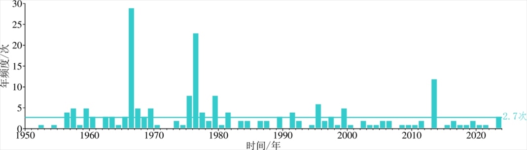 2023年以來大陸東部及附近海域發(fā)生5級(jí)以上地震3次,分別為6月24日北部灣5.0級(jí)、8月6日山東平原5.5級(jí)和10月23日廣東南澳縣海域5.0級(jí)地震,地震活動(dòng)水平較2022年(0次)顯著增強(qiáng),為 2014 年以來活動(dòng)頻次最高年份。